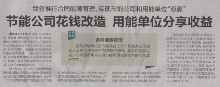 海南日报海口2014年11月21日讯。用能单位不用掏钱,由节能服务公司投资实施节能项目,节能收益则由节能服务公司和用能单位共同分享,实现“双赢”。这就是我们俗称的合同能源管理模式。